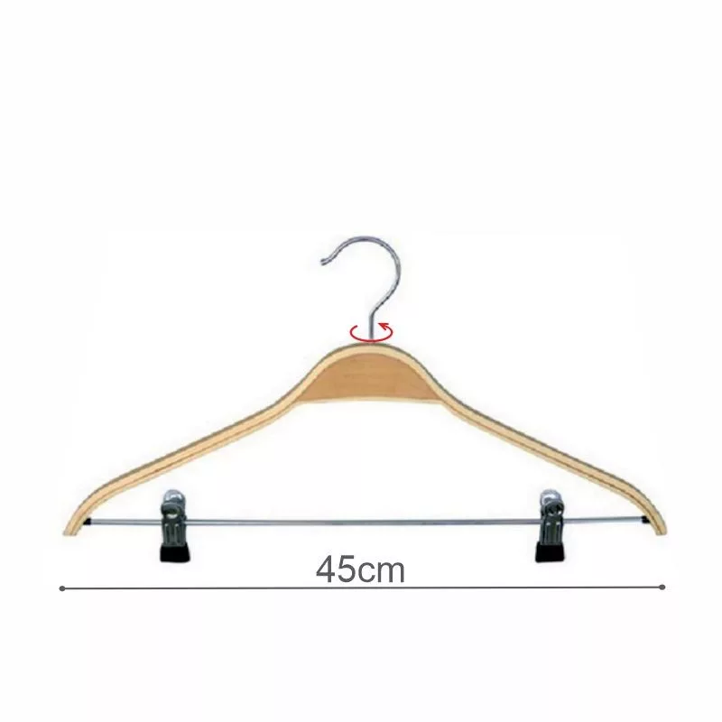 Percha laminada barnizada para conjuntos con pinzas antideslizantes. Ideal para camisas, pantalón. Tiene un grosor reducido de 1,20 cm resultando muy práctica para ahorrar espacio. 45cm de largo. Color natural.