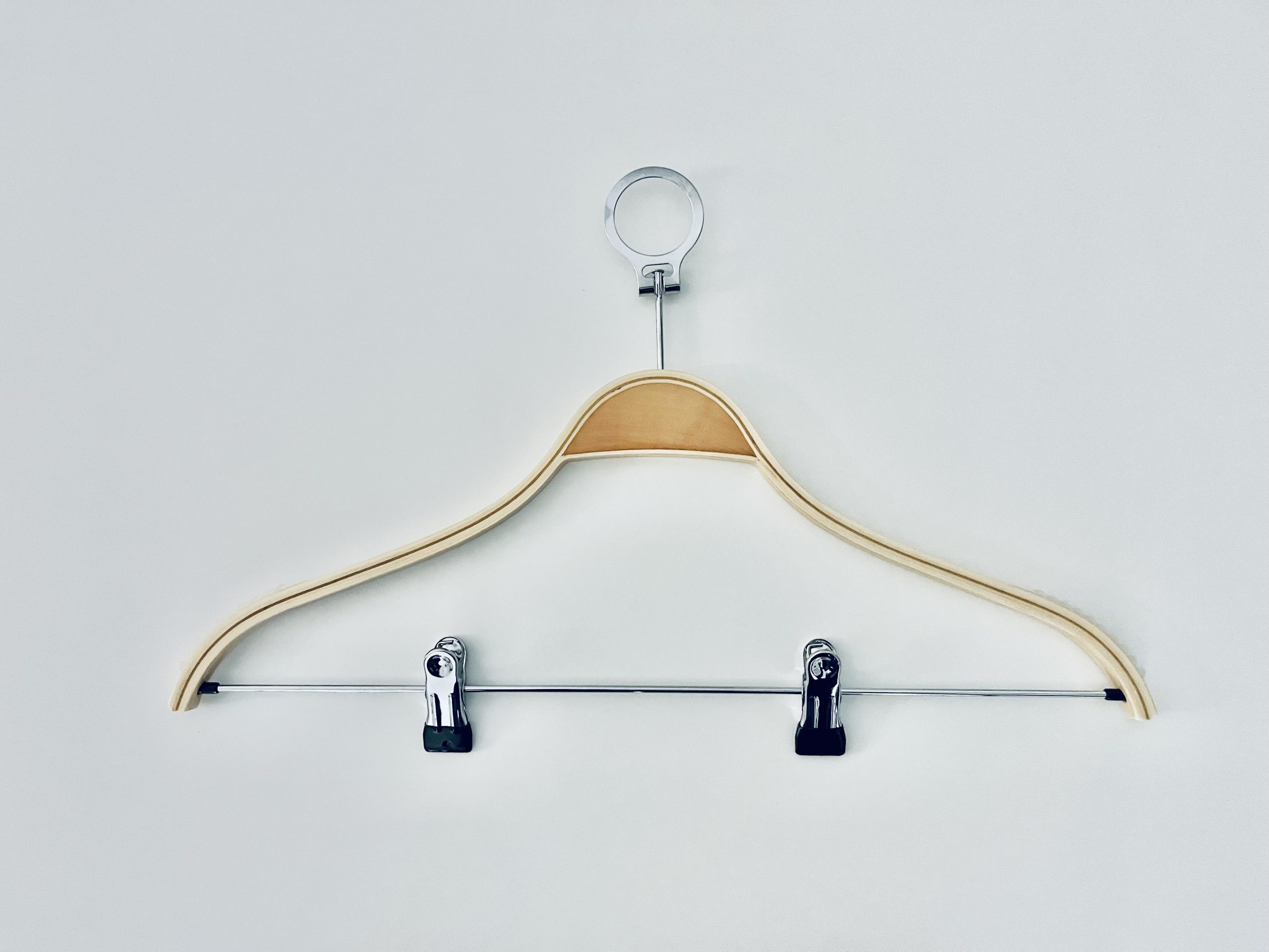 Percha hotel de madera laminada para conjunto con pinzas. 45cm largo. Color natural.