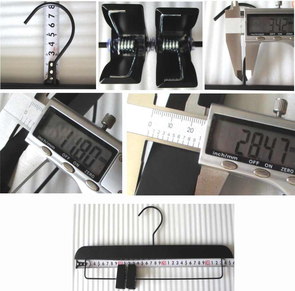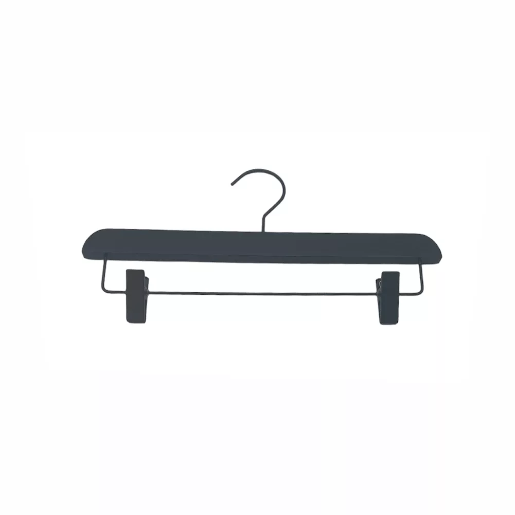 Percha de madera lacada en negro con pinzas para faldas y pantalones