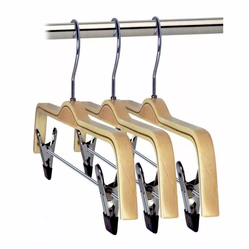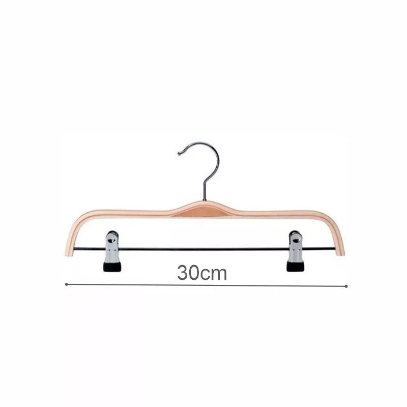 Percha laminada barnizada con pinzas antideslizantes. Ideal para falda, pantalón infantil. Tiene un grosor reducido de 12mm resultando muy práctica para ahorrar espacio. 30cm de largo. Color natural.