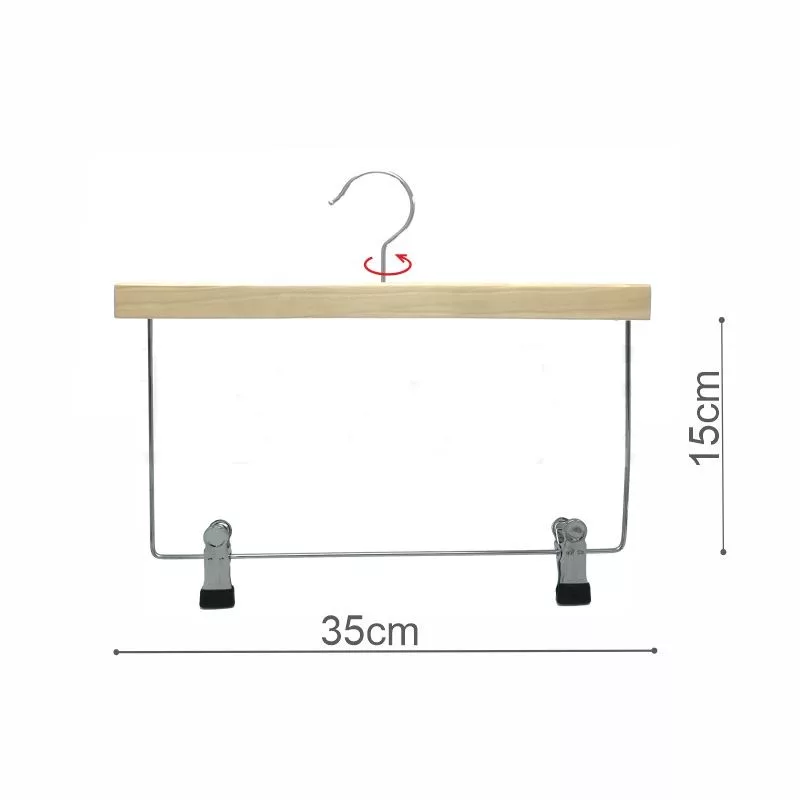 Percha elaborada en madera barnizada. Con pinzas antideslizantes para falda o pantalón. Tiene un grosor reducido resultando muy práctica para ahorrar espacio. 35cm de largo. Color natural.