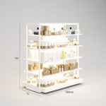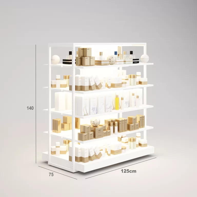 Perfumería Góndola SQ, estantes de madera con iluminación led, fondo liso y Tarima (Tubo Cuadrado25mm)