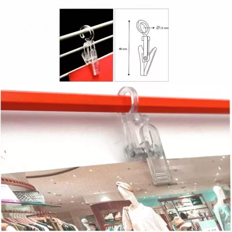Pinza con anillo giratorio. De plástico transparente. Para colocar carteles de precios o promociones en cualquier punto de venta.