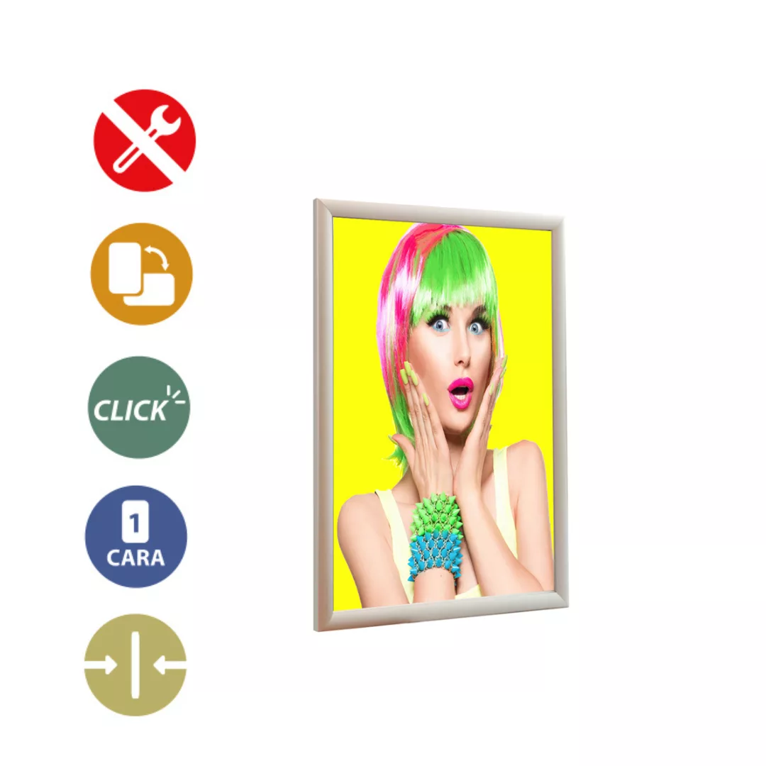 Portacartel con apertura frontal para fácil cambio de imagen. Tamaño imagen A2. Marco color gris brillo.