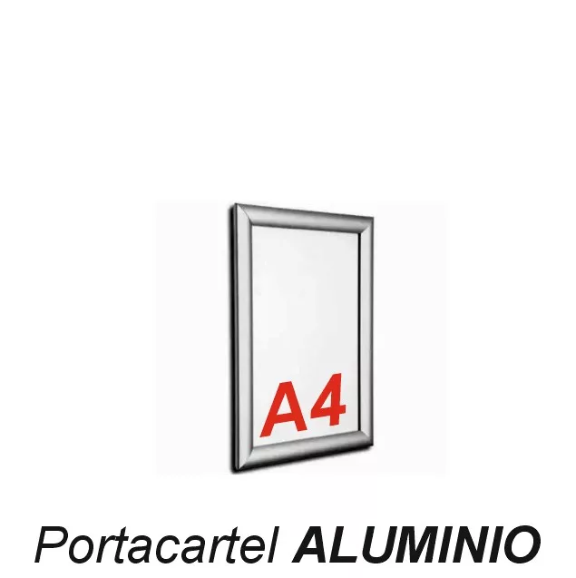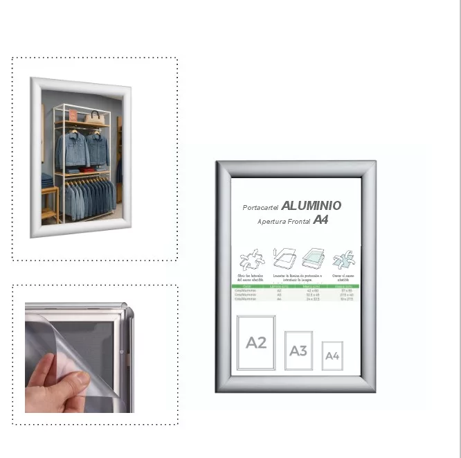 Portacartel con apertura frontal para fácil cambio de imagen. Tamaño imagen A4. Marco en aluminio.