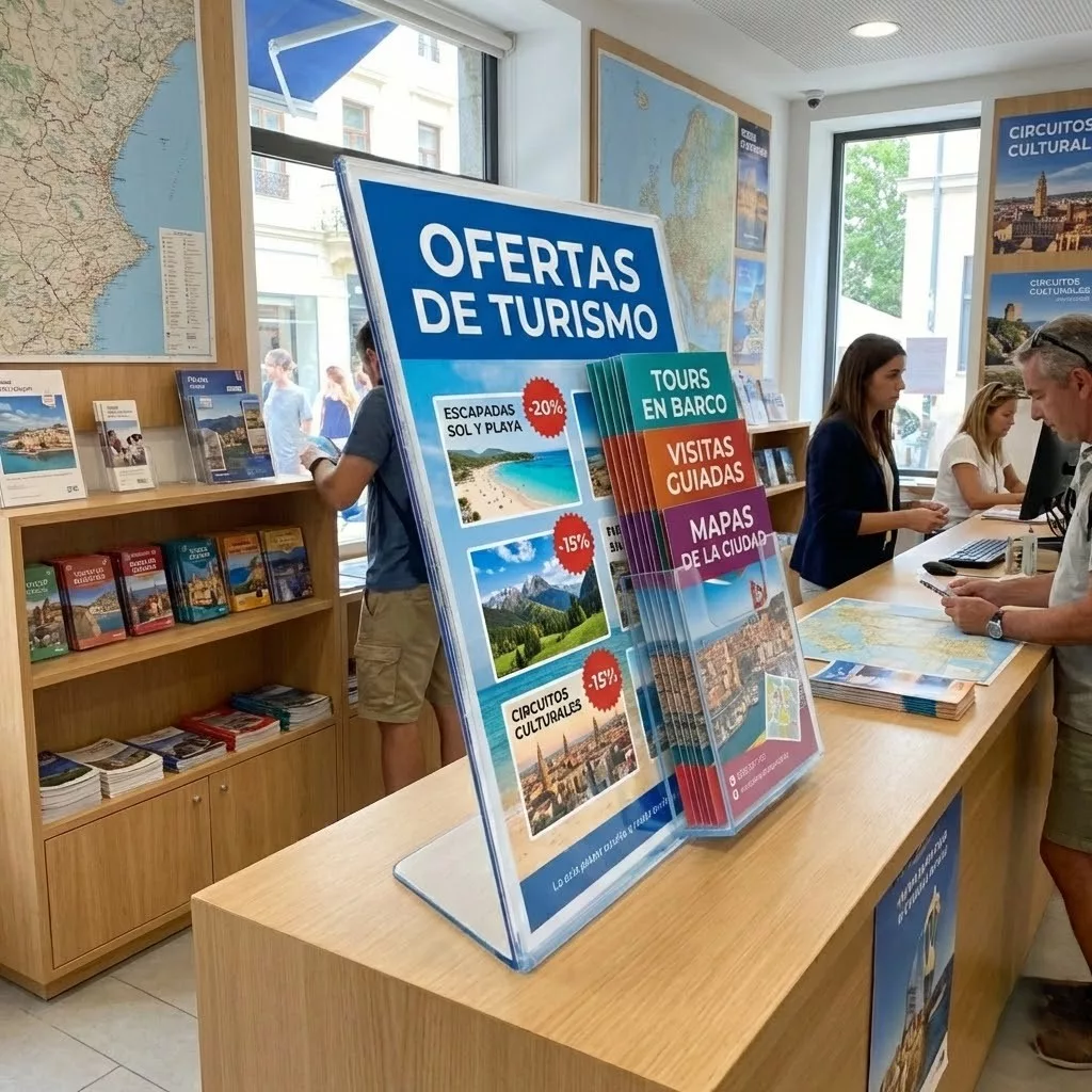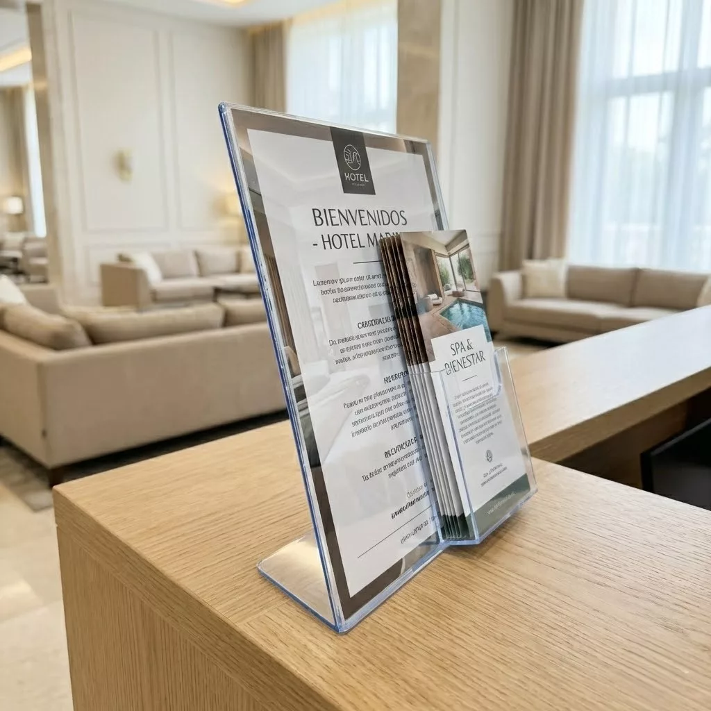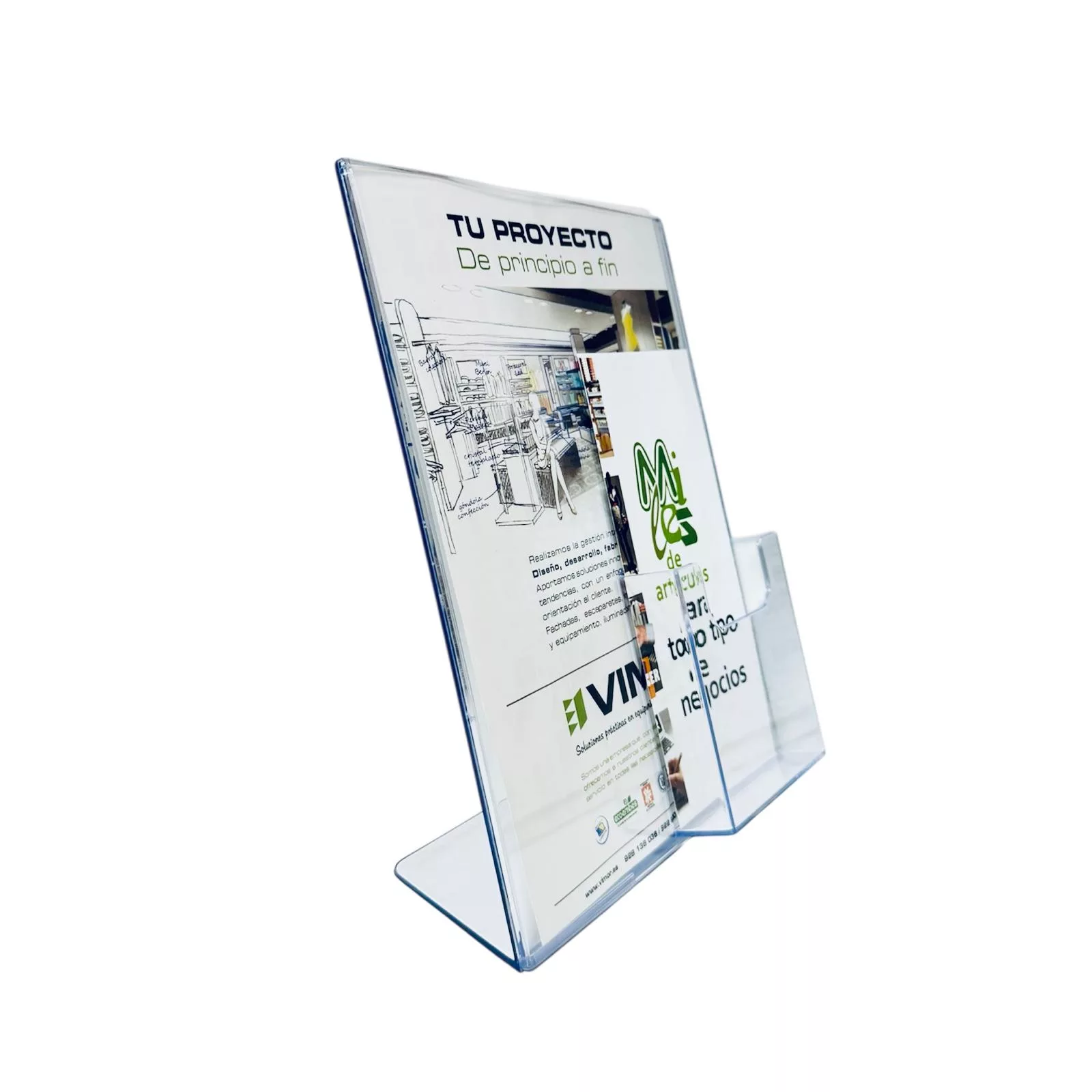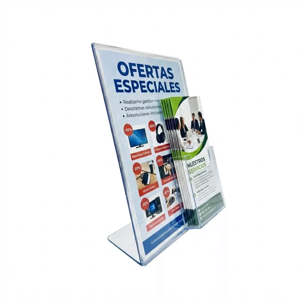 Portacartel inclinado e independiente proporciona una presentación atractiva de su promoción y  folletos.