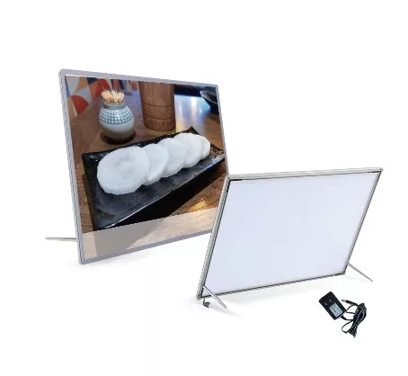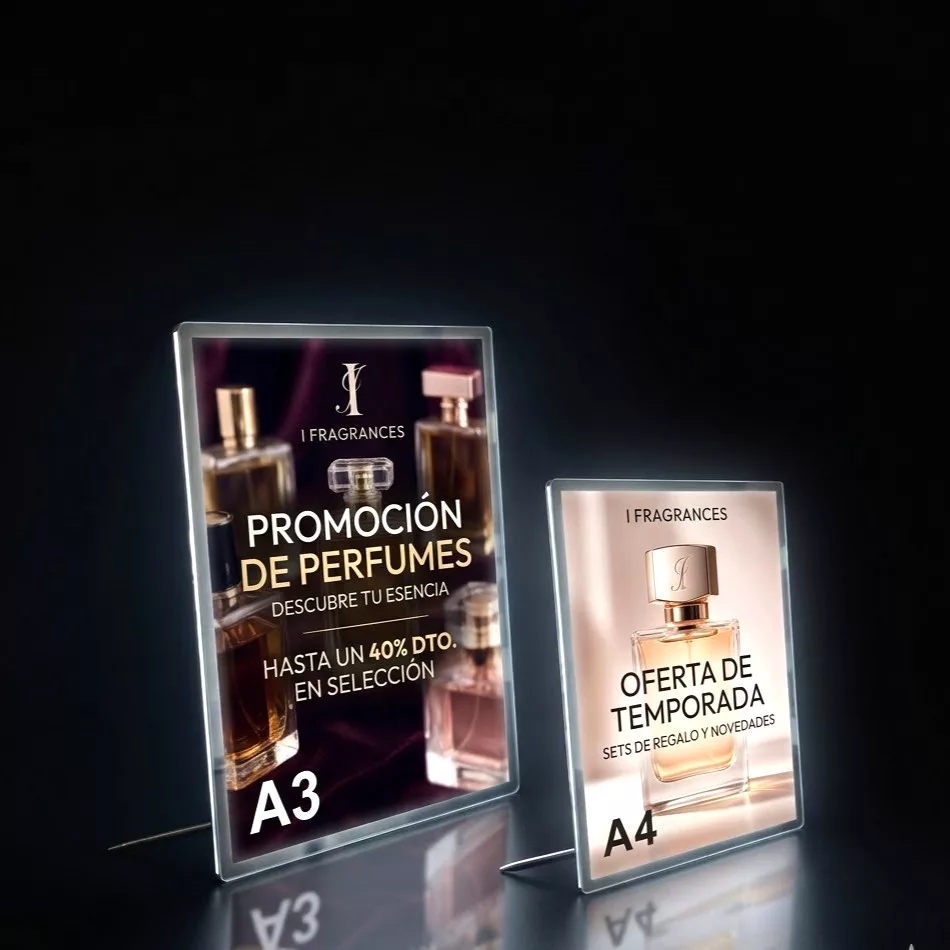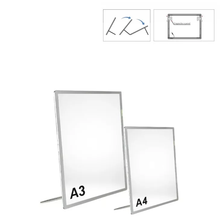 Portacartel LED SOBRE con enganches a pared y para mesa. Fácil para cambiar imagen. HORIZONTAL O VERTICAL