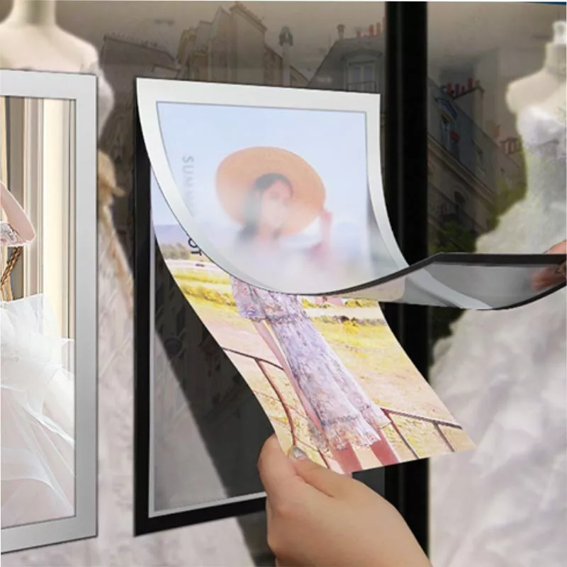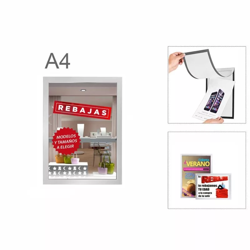 Portacartel plástico con imán para poner en pared, cristal, mobiliario… Apertura para colocar cartel con imán. Adhesivo para pegar en superficie de cristal, pared, madera…. Tamaño  din A4. Color gris.