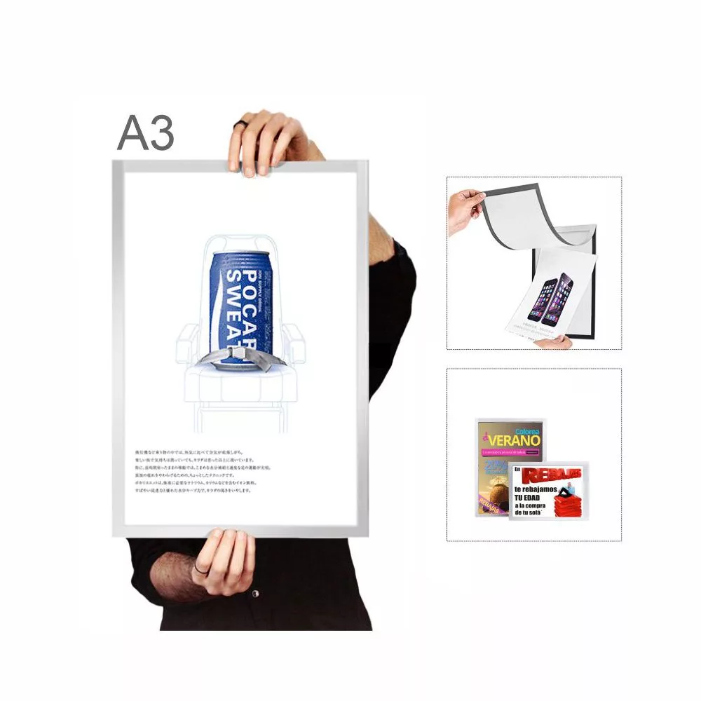Portacartel plástico con imán para poner en pared, cristal, mobiliario… Apertura para colocar cartel con imán. Adhesivo para pegar en superficie de cristal, pared, madera…. Tamaño  din A3. Color gris.