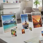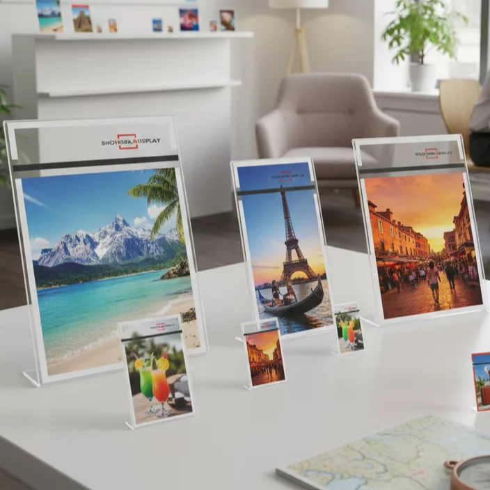 Portacartel poliestireno con base T. Color transparente. Base en blanco y negro.