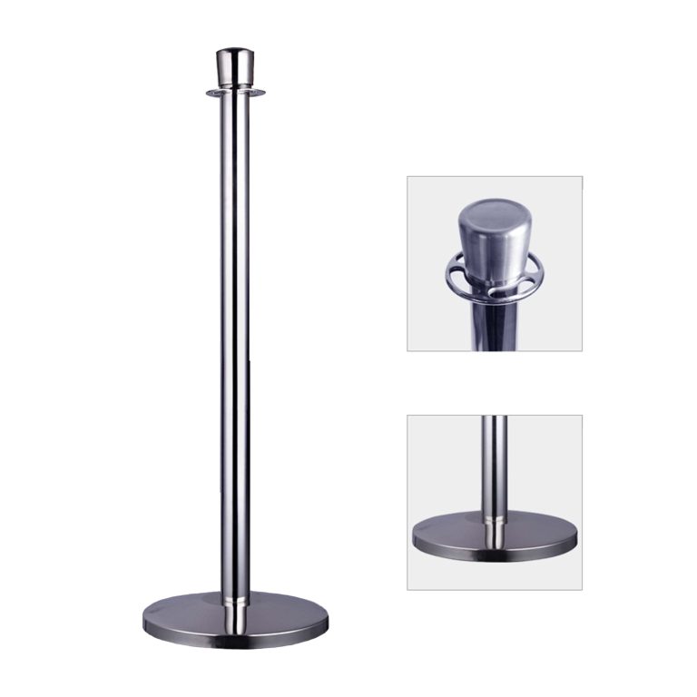 Poste separador clásico para formar colas con cordón.100cm de alto, base, diámetro del tubo 50.80mm. Cabeza tipo corona. Base cubierta 350mm diámetro, de hierro con goma debajo de la base para proteger el suelo, peso total 7kilos . Color cromado.