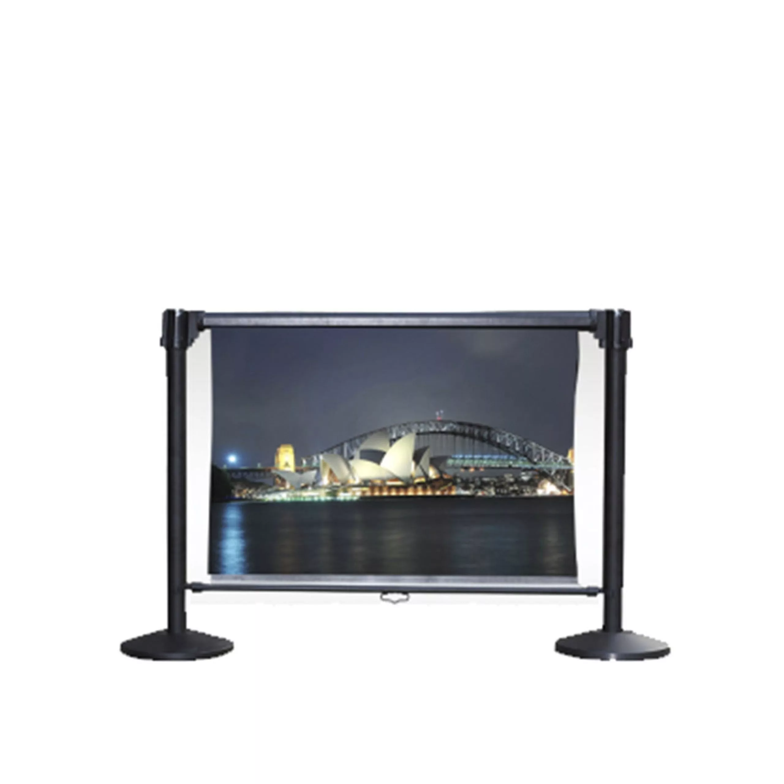 Poste separador doble con banner con lona negra 1120 x 900mm. Abrazaderas de plástico sostienen el poste en la parte inferior.