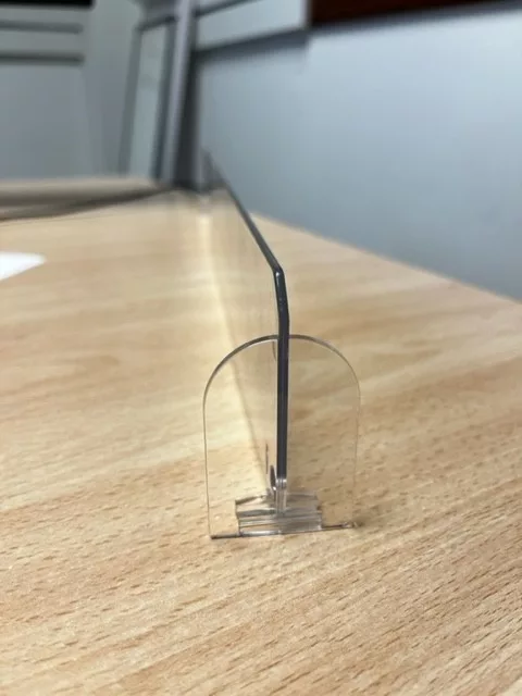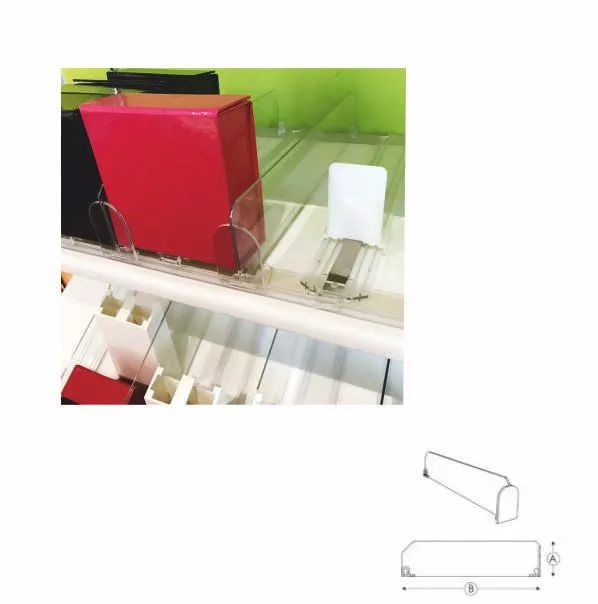 Separador central de plástico con parada frontal de 3.3cm para estantes. Color transparente.