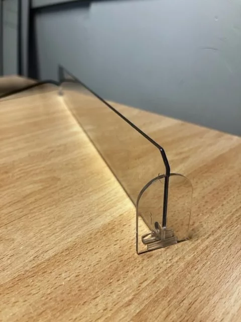 Separador central de plástico con parada frontal de 3.3cm para estantes. Color transparente.