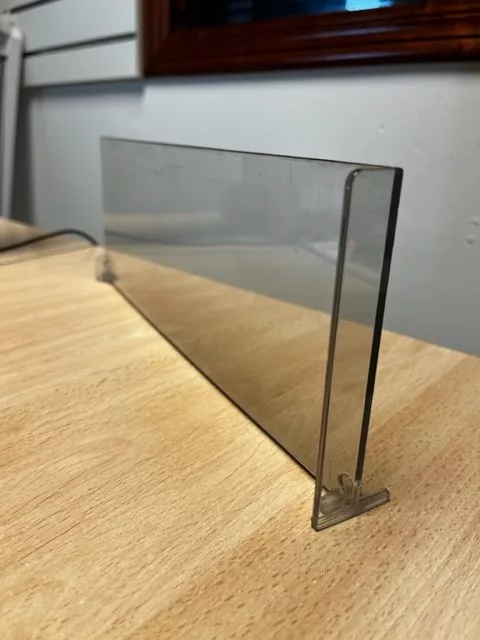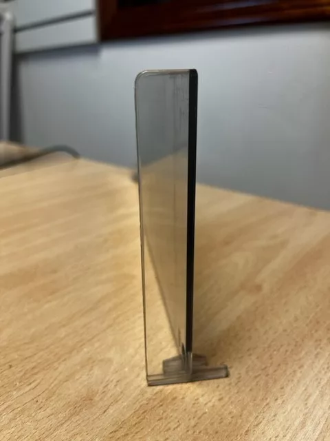 Separador derecho de plástico con parada frontal de 1.7cm para estantes. Color transparente.