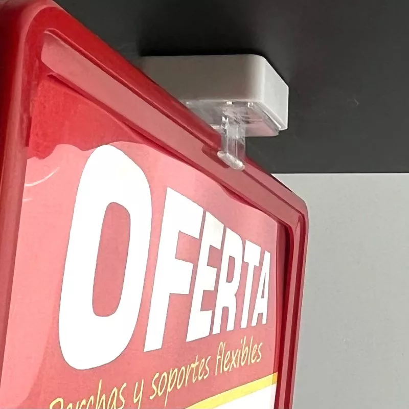 Soporte magnético que se fija fuertemente a una superficie metálica con porta cartel que permite colocar promociones, precios … . de manera sencilla, flexible y rápida en paredes, postes o debajo de los estantes.