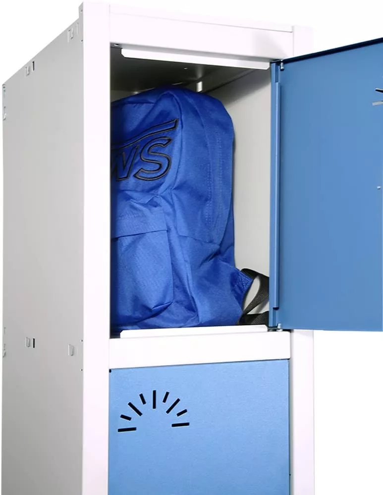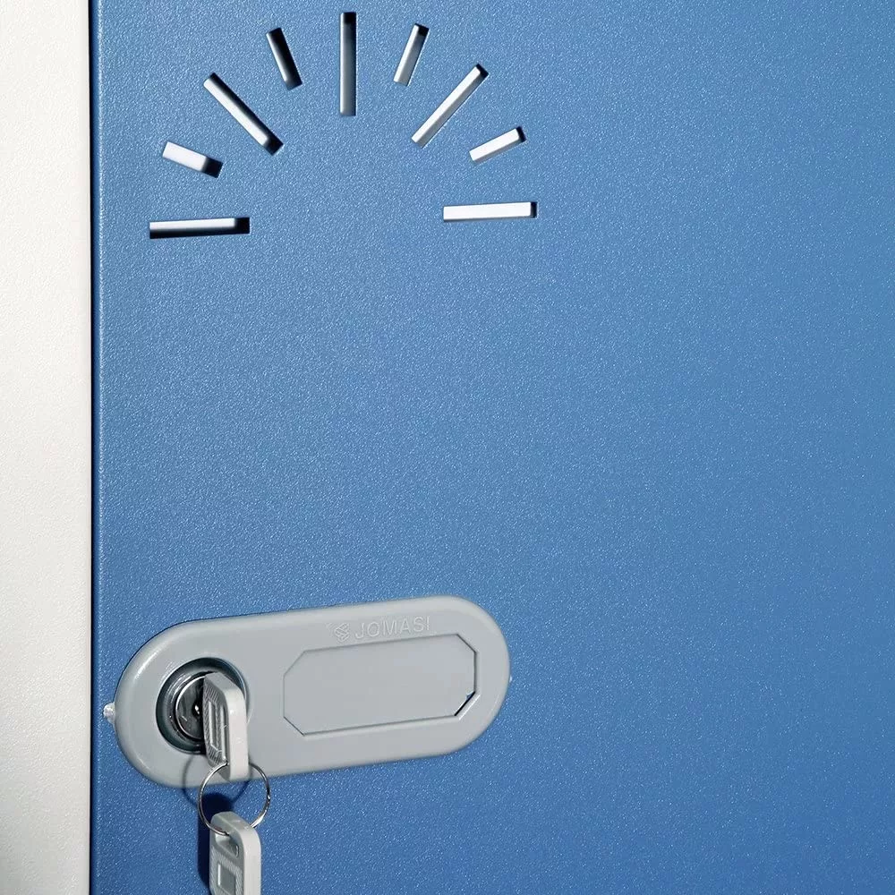 Consigna de 5 puertas metálico con dos laterales. Estructura en color gris (RAL7035) y puertas con llave en azul (RAL 5014). Otros colores a consultar. . Fácil montaje sin tornillos. Desmontado.