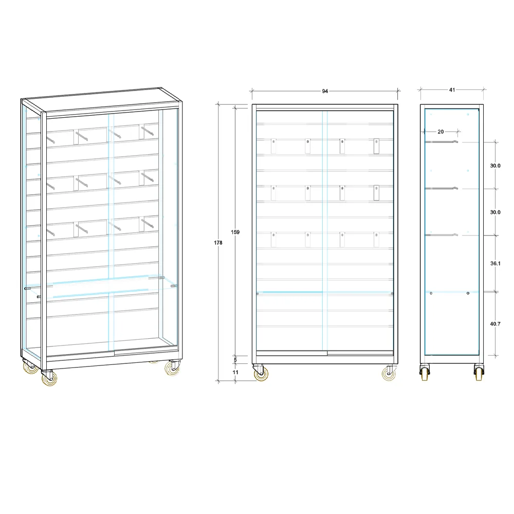 Vitrina terraza estructura en gris matelé con dos ruedas fijas y dos giratorias con freno. Estructura compacta de gran solidez con acabado en pintura epoxi gris martele especial exteriores.