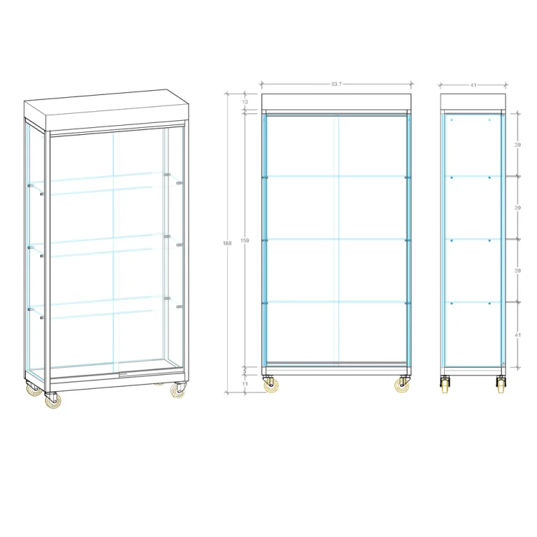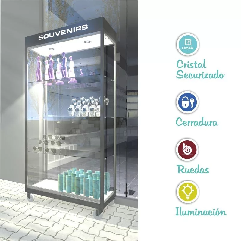 Cristales laterales y estantes 8mm TEMPERED SECURITY, puertas correderas de cristal con cerradura, ruedas para exteriores de gran resistencia, cajetín con focos.